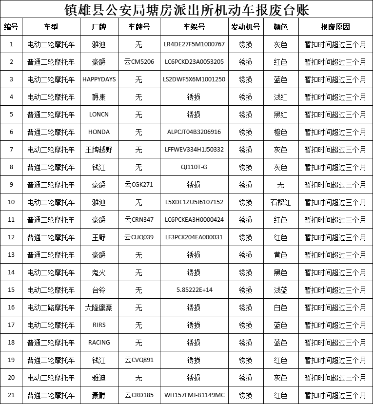 镇雄县公安局关于清理扣留违法机动车辆的公告【2025年第11..