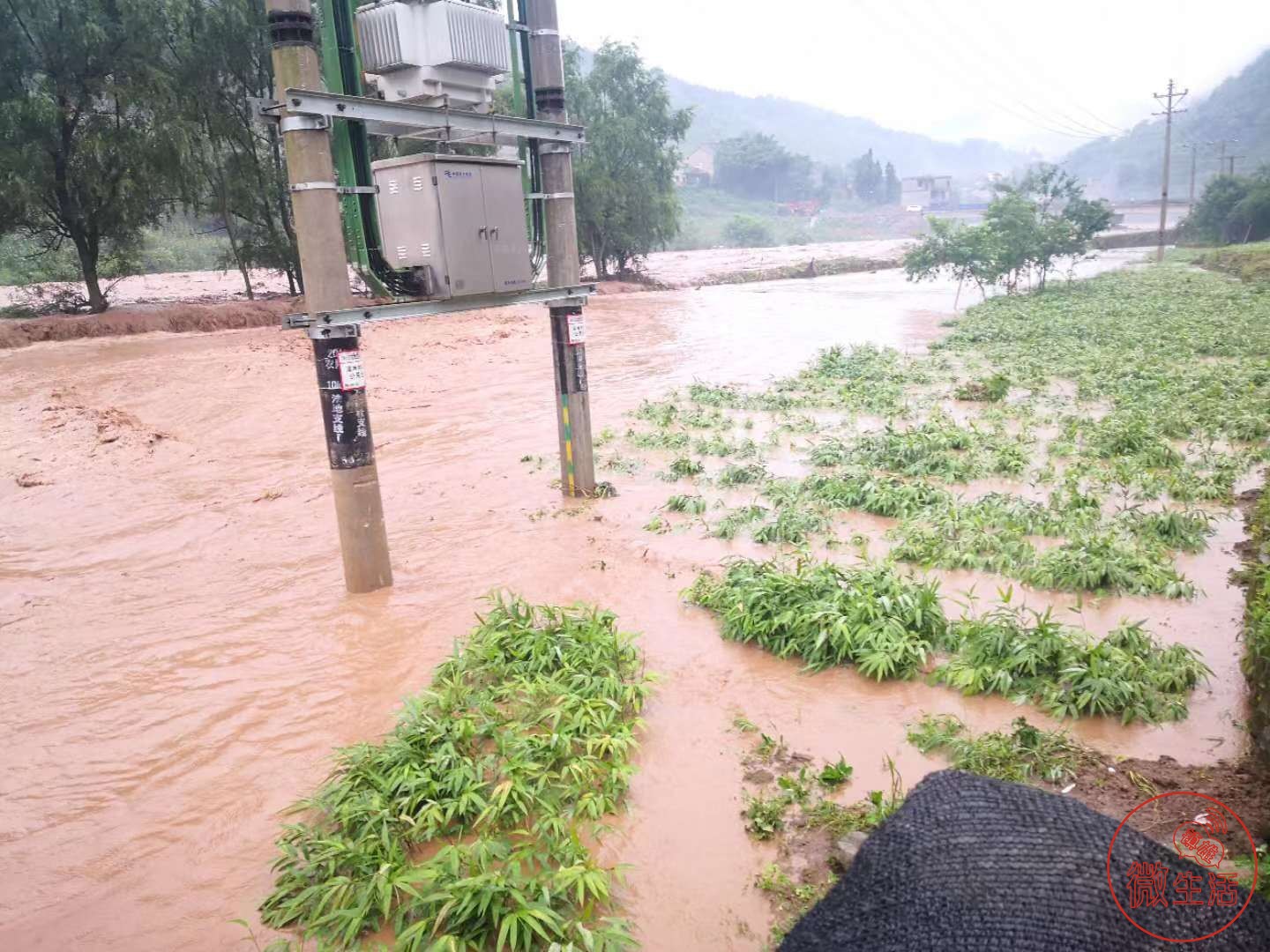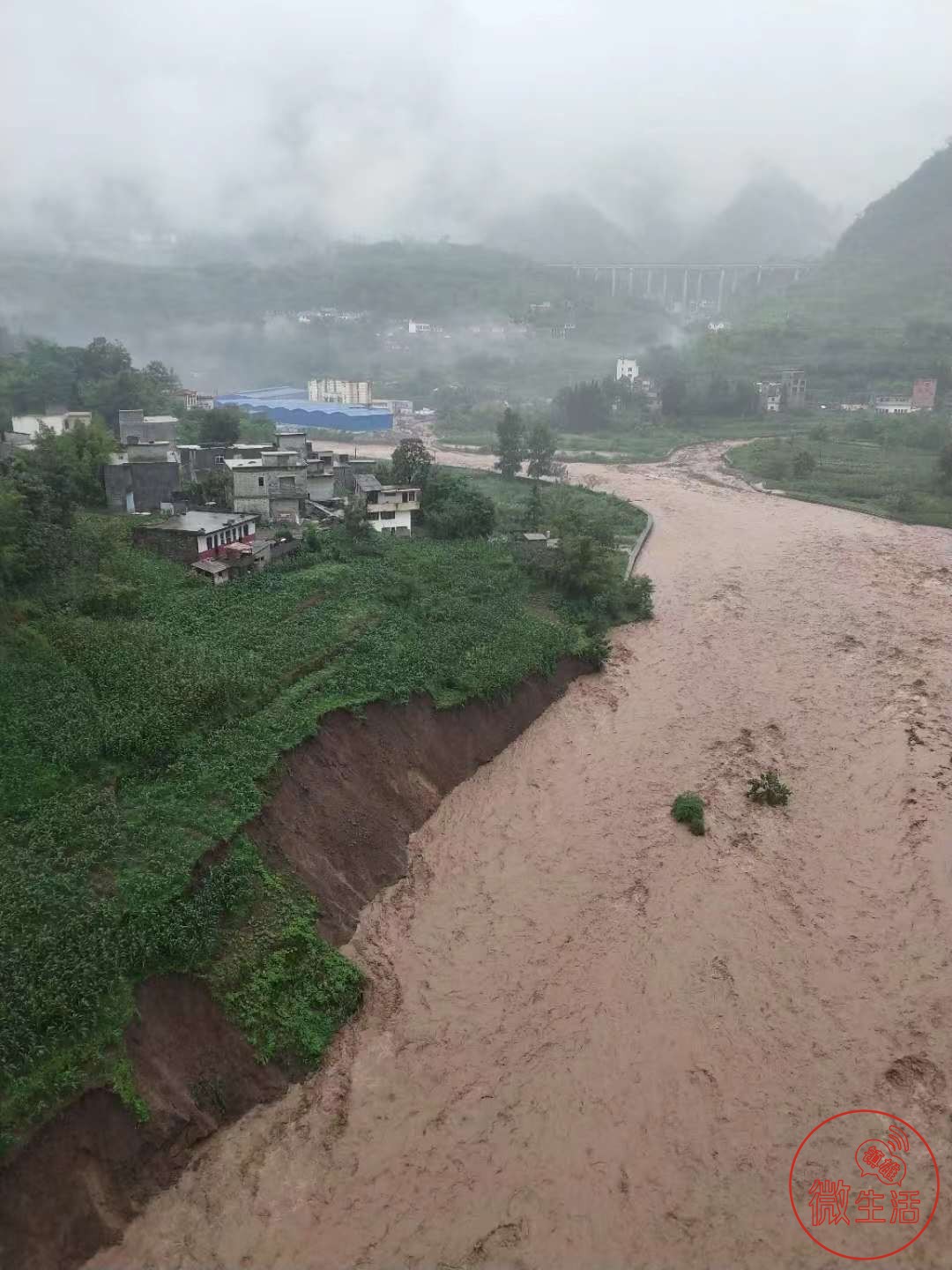 文阁村沙坡大桥的水位超过警戒线,漫上了桥堤。