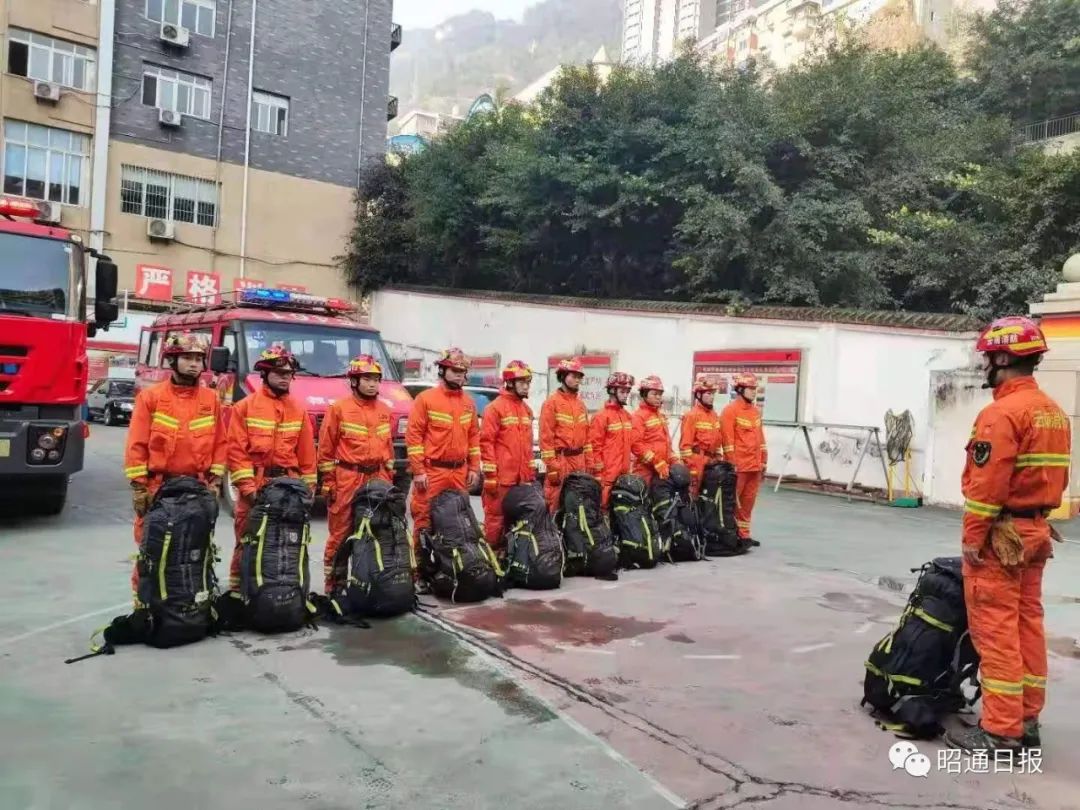23日2时50分,春城晚报-开屏新闻记者获悉,地震发生后,盐津县消防救援大队出动了3辆车、14人,第一时间赶往震中地区——盐津县落雁乡开展救援。与此同时,昭通市消防救援支队接到通报后,该支队全勤指挥部立即紧急响应,迅速调派了10辆车、46人和4条搜救犬,前往灾区增援。