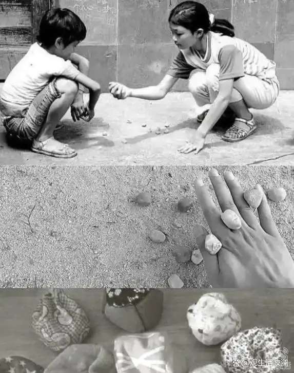 女生们疯跑着先来一场充满速度与激情的“打死救活”,跑得大汗淋漓,满脸通红;或拍打着用地膜胶纸裹紧、毛线缠绕的毛蛋,踢着吃鸡;有的则蹲在地上捡子,时不时惊呼一声:“看到没,我背到七斗,”也有的单脚踢着石头“跳房子”;男生则是栽钉,画出犹如麦田怪圈般巧夺天工的图案,或跳拱、打弹珠、滚铁环……