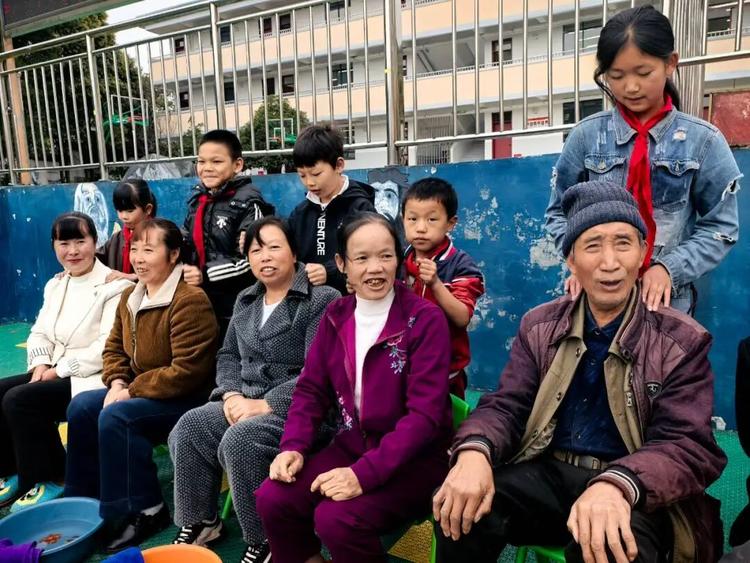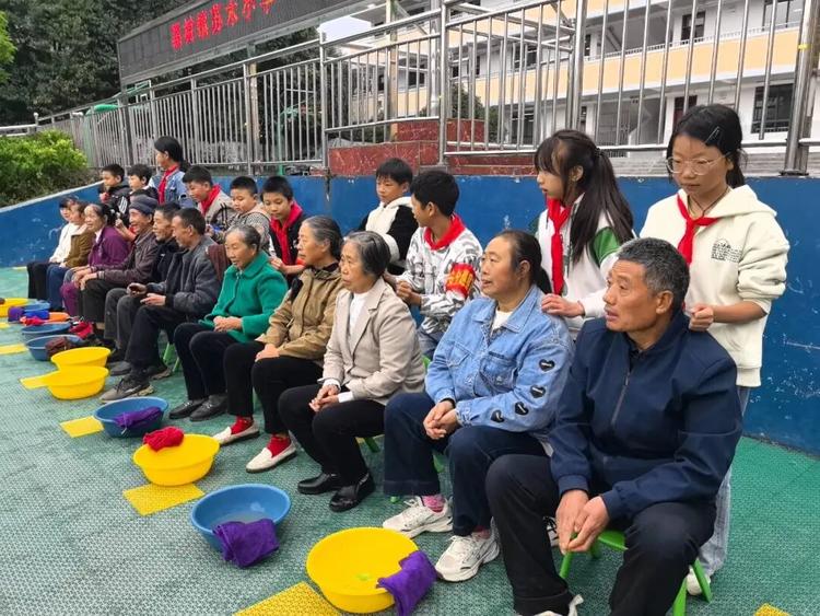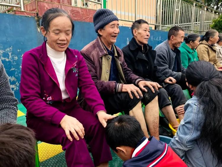 这样的场景在现场不断上演。11岁的男孩小浩熟练地为爷爷按摩肩膀,“爷爷腰不好,我天天给他捶背。”他的手法虽然稚嫩,却格外认真。爷爷笑得合不拢嘴:“娃娃长大了,懂事了。”看着为自己洗脚的孙子孙女,老人们脸上满是欣慰,虽然没有太多语言表达,但藏不住脸上的笑容,嘴里不断重复说着:“要好好学习,听老师的话。”