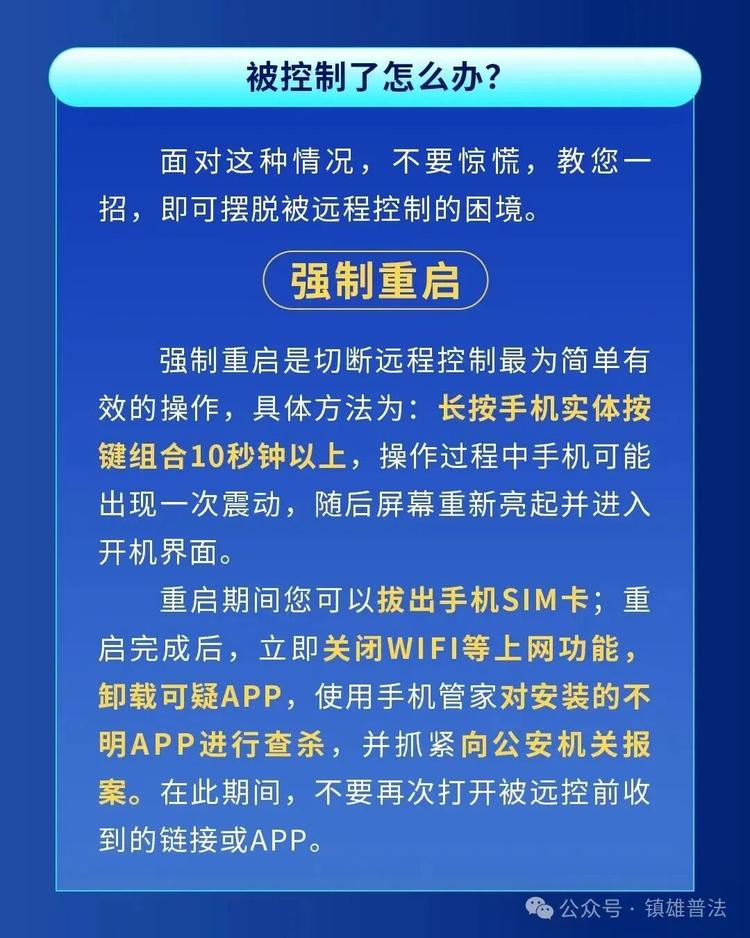 1、强制重启手机:长按电源键10秒以上(不同机型方法不同),切断远程控制。