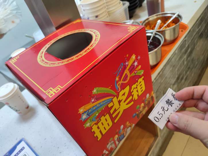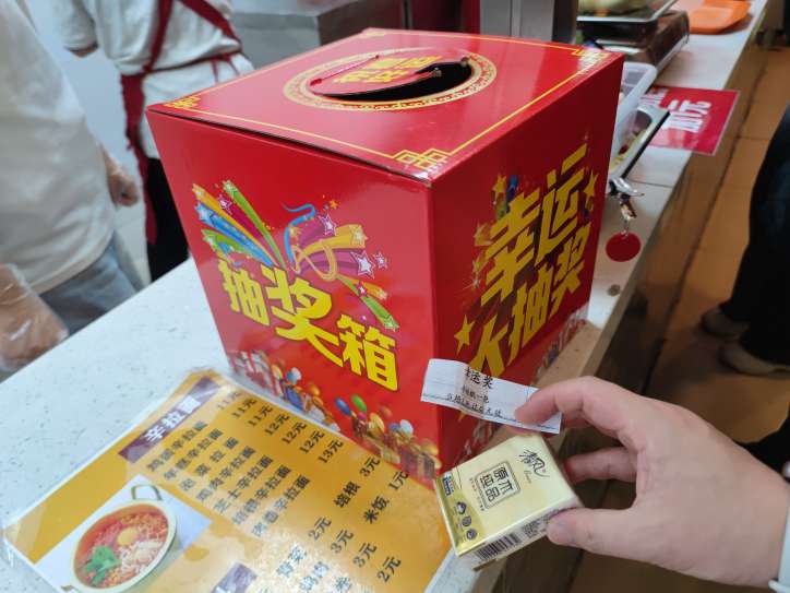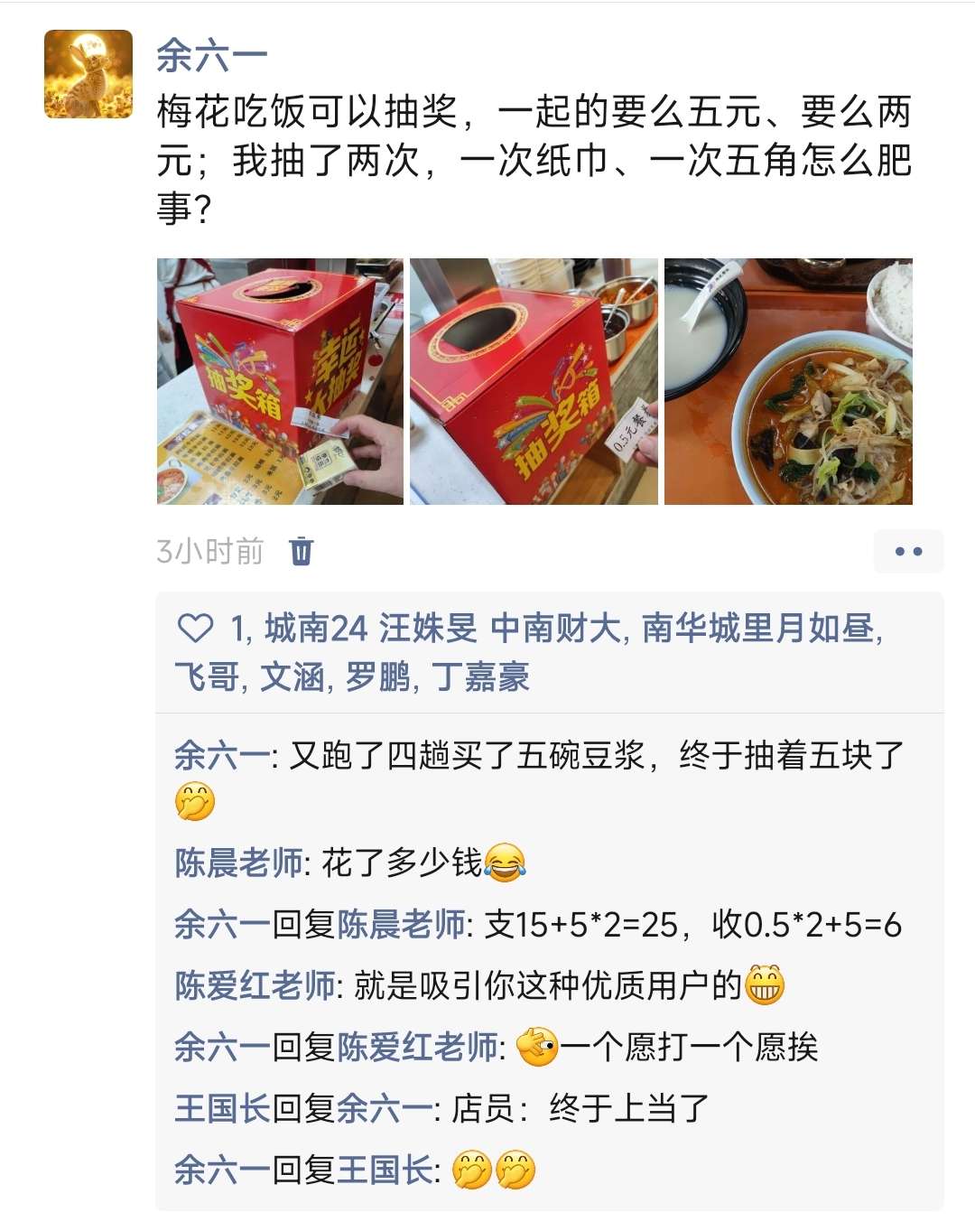 梅花吃饭可以抽奖,一起的要么五元、要么两元;我抽了两次,一次纸巾、一次五角怎么肥事?