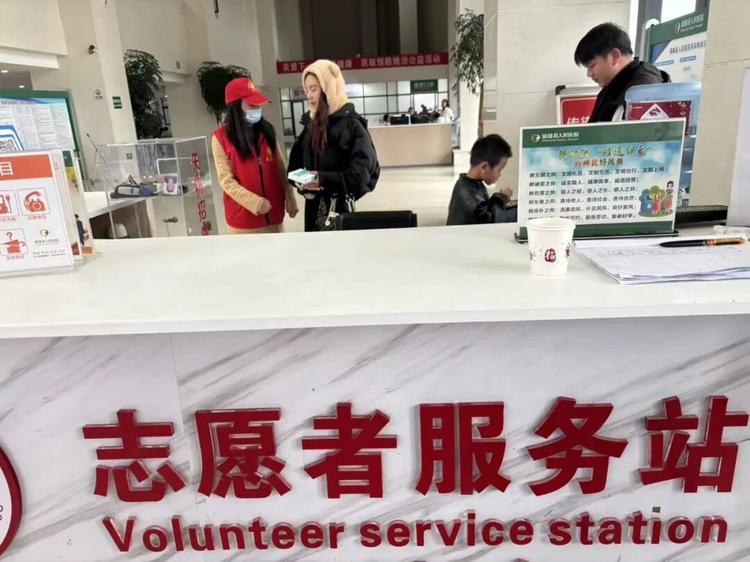 一旁的志愿者服务站,则由经过专业培训的志愿者主动提供雨伞、开水、失物登记招领,帮助老年患者、行动不便人群协调轮椅借用、指尖挂号缴费、电子医保登记、自助设备操作等服务。
