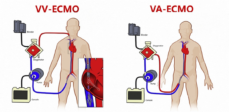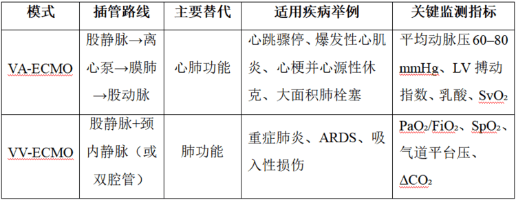 按照治疗目的,ECMO主要分为静脉-静脉体外膜肺氧合(veno-venous extracorporeal membrane oxygenation,VV-ECMO)和静脉-动脉体外膜肺氧合(veno-arterial extracorporeal membrane oxygenation,VA-ECMO)两种。