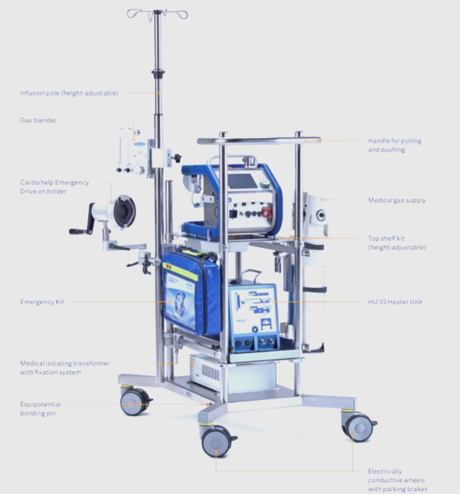 ECMO装置主要由血管通路、驱动单元(泵)、膜式氧合器(又称“膜肺”)、监测及控制系统、空氧混合器和变温水箱组成: