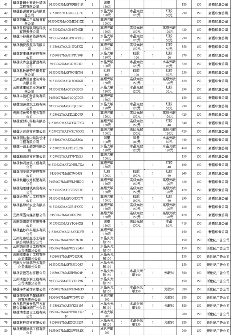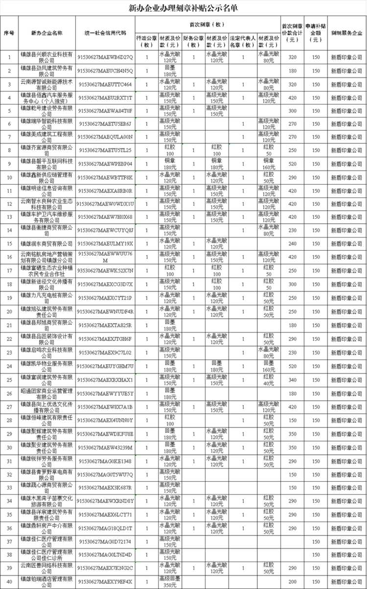 根据《昭通市人民政府关于促进经济平稳健康发展的意见》(昭政发〔2021〕8号)文件通知要求,为进一步优化营商环境,我局决定对2025年3月31日以来的新开办企业首套印章刻制进行补贴,每户补贴150元。截至2025年10月31日我县新办219户企业拟申请办理刻章补贴,现作如下公示: