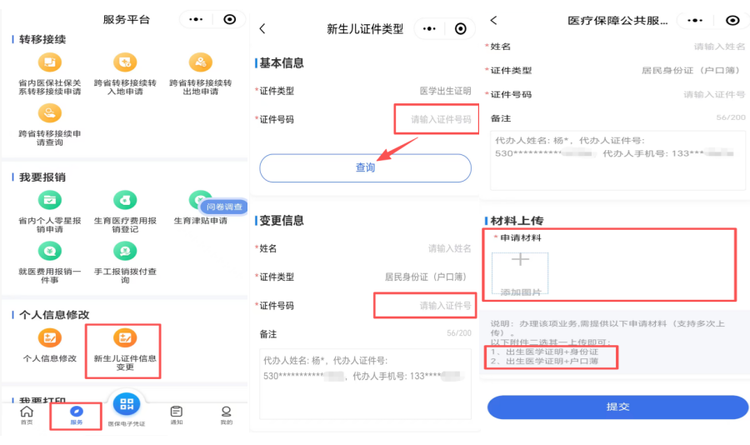 点击【服务】进入页面,找到“个人信息修改”模块,点击“新生儿证件信息变更”功能,输入新生儿的“出生医学证明编号”,点击“查询”,查询出新生儿基本信息后,姓名不可更改,输入新生儿“身份证号码”。材料上传“出生医学证明+身份证”或“出生医学证明+户口簿”,点击【提交】即可。