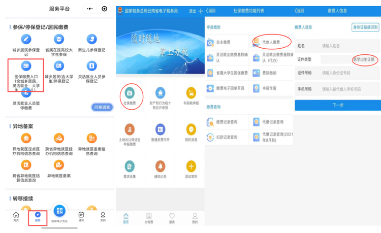 打开“云南医保”小程序,点击【服务】进入页面,找到“参保/停保登记/居民缴费”模块,点击“医保缴费入口(含城乡居民、灵活就业、大学生、新生儿)”功能,跳转至税务渠道进行缴费。