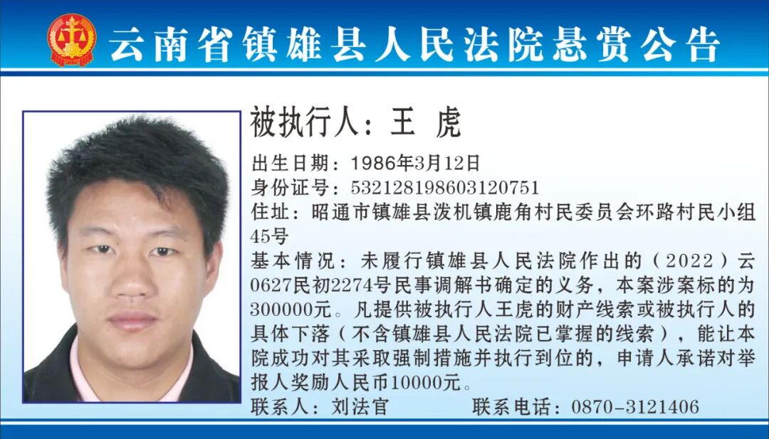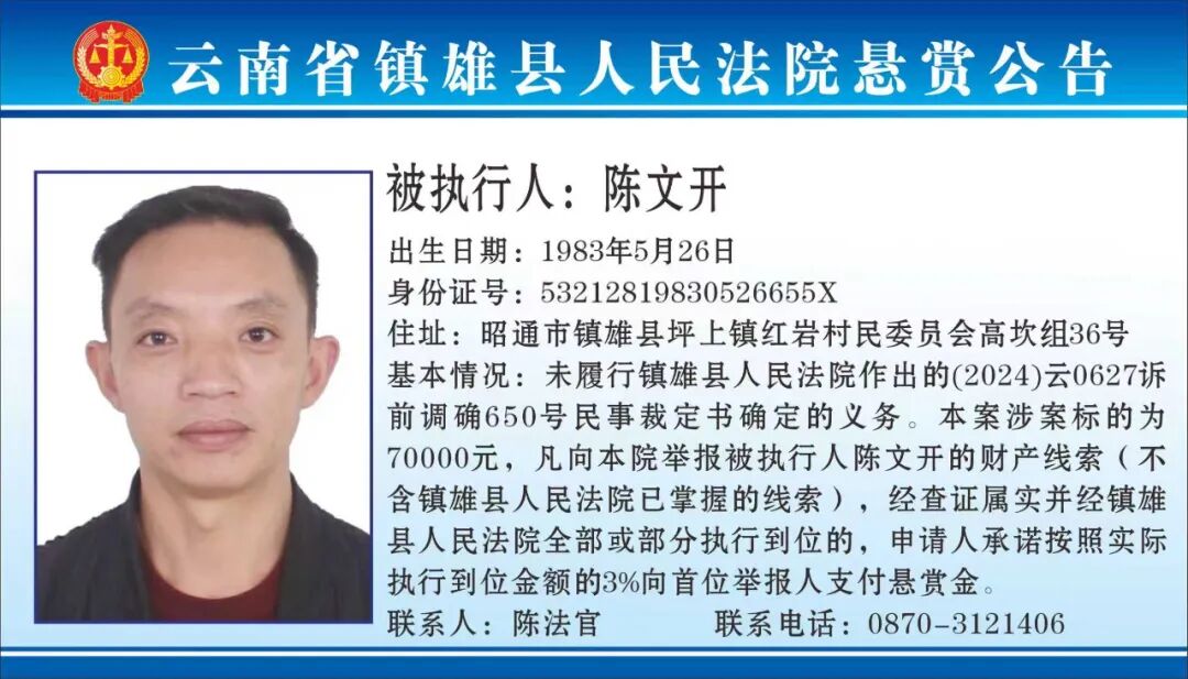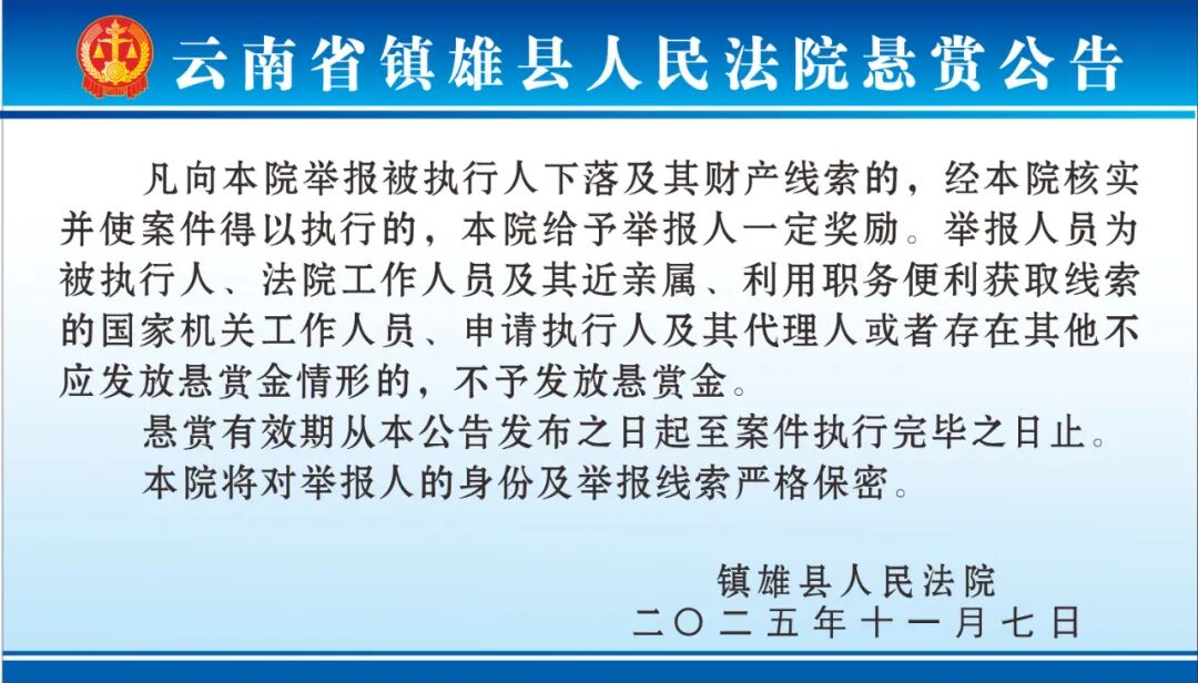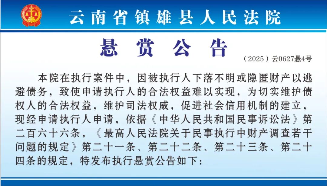 云南省镇雄县人民法院悬赏公告(2025年第4期)!