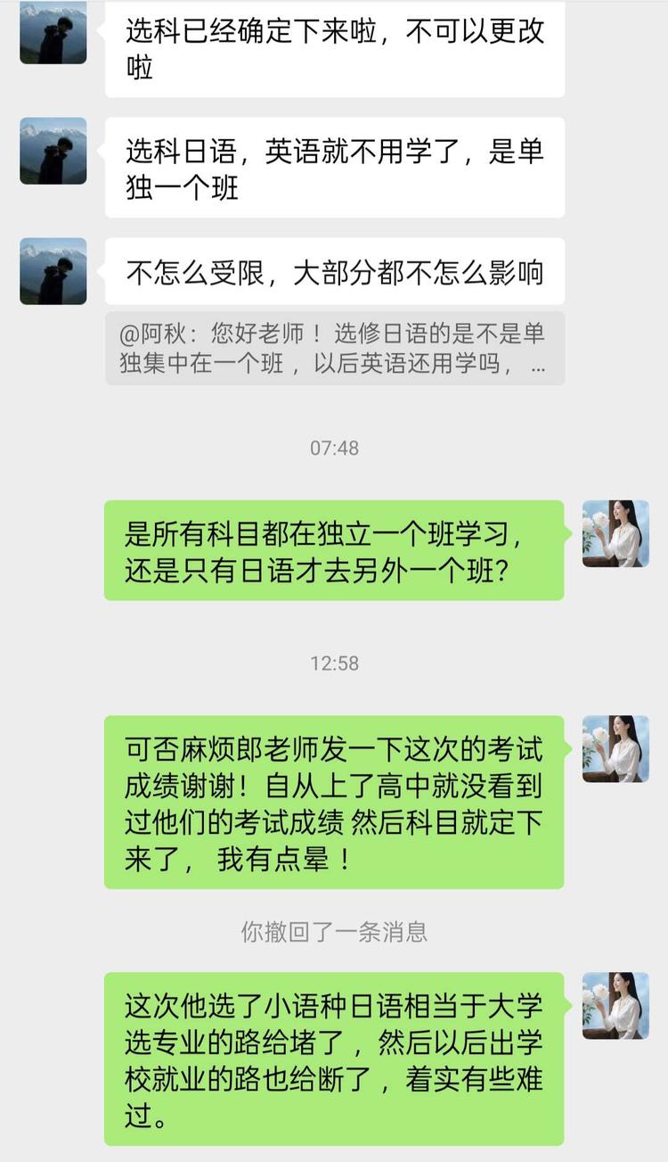 本以为孩子上高中后能顺顺利利开启学习之旅,结果麻烦事儿说来就来。从高一开学直到现在,家长连学生的成绩单都没见过,这心里本就没底。现在又要稀里糊涂地选科,简直让人一个头两个大!关键问题是,孩子英语成绩不太理想,选了小语种日语。可这学校的日语班到底靠不靠谱呢?是所有科目都在一个班完成,还是日语单独分班授课?再者,日语班的师资组合情况如何?这个日语班到底是重点班、普通班,还是那种没啥优势的超普通班?真的太令人纠结了!特别希望前期毕业班的家长能分享点宝贵意见,简直急得不行!另外,大学专业不知道该怎么选,孩子毕业后的就业方向又该如何规划,这一桩桩一件件,愁死人啦!