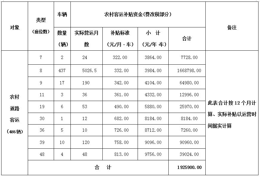 2024年在我县获得农村客运补贴资金的车辆总数为485辆,补贴资金共计192.59万元,按车型标准及实际运行时间区别计算: