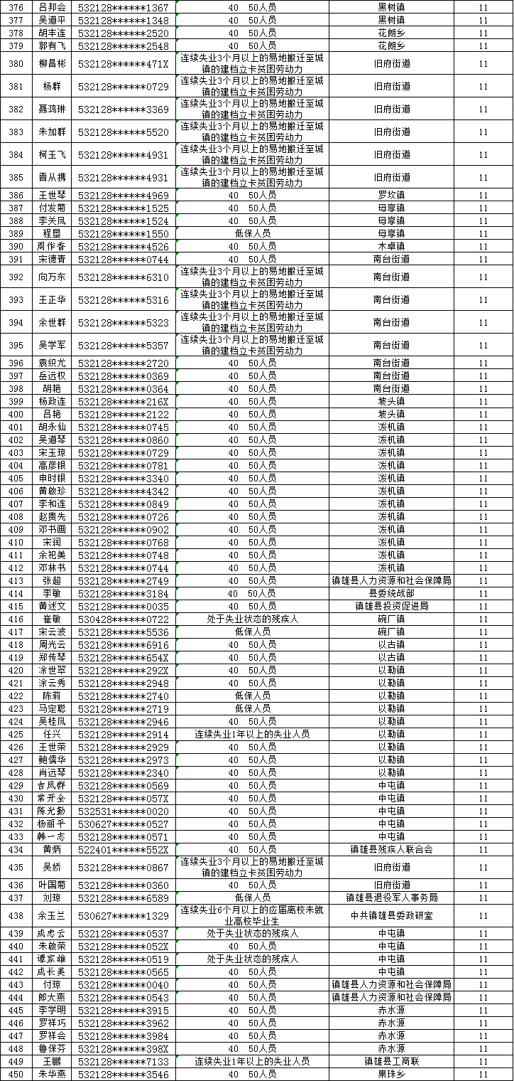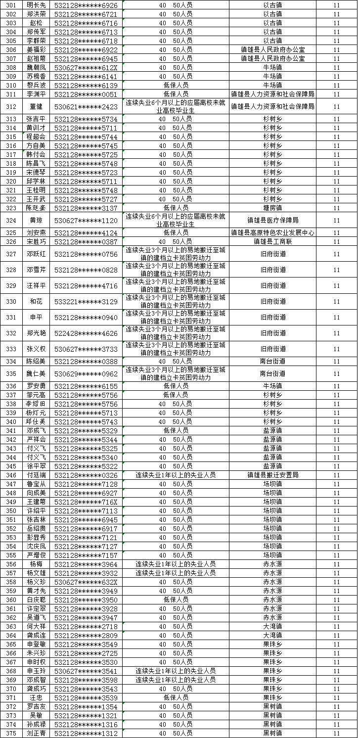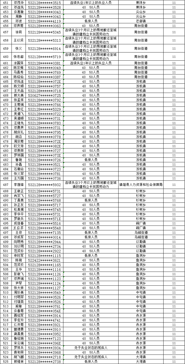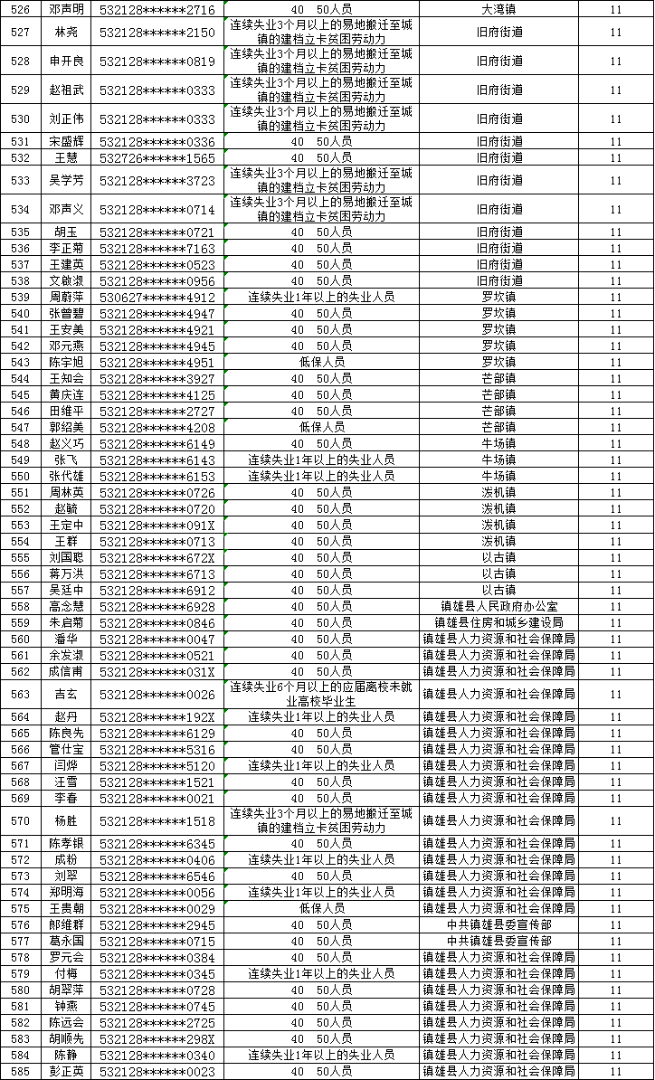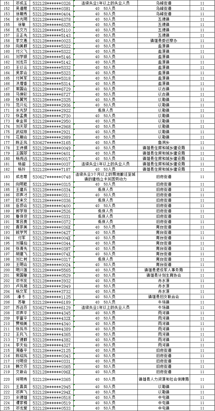 根据《云南省财政厅 云南省人力资源和社会保障厅关于印发云南省就业补助资金管理办法的通知》要求,现将镇雄县2025年11月城镇公益性岗位人员在岗情况名单予以公示,若发现通过其他途径已转岗就业的;达到法定退休年龄或死亡的;无故旷工连续15天或一年内累计旷工30天的;被依法追究刑事责任的;存在冒名顶替或张冠李戴的;存在有吃空饷、转包代岗、人岗分离等情况的,请在公示期内(2025年11月11日—2025年11月15日)向镇雄县公共就业和人才服务中心反映,电话:0870—3120645。