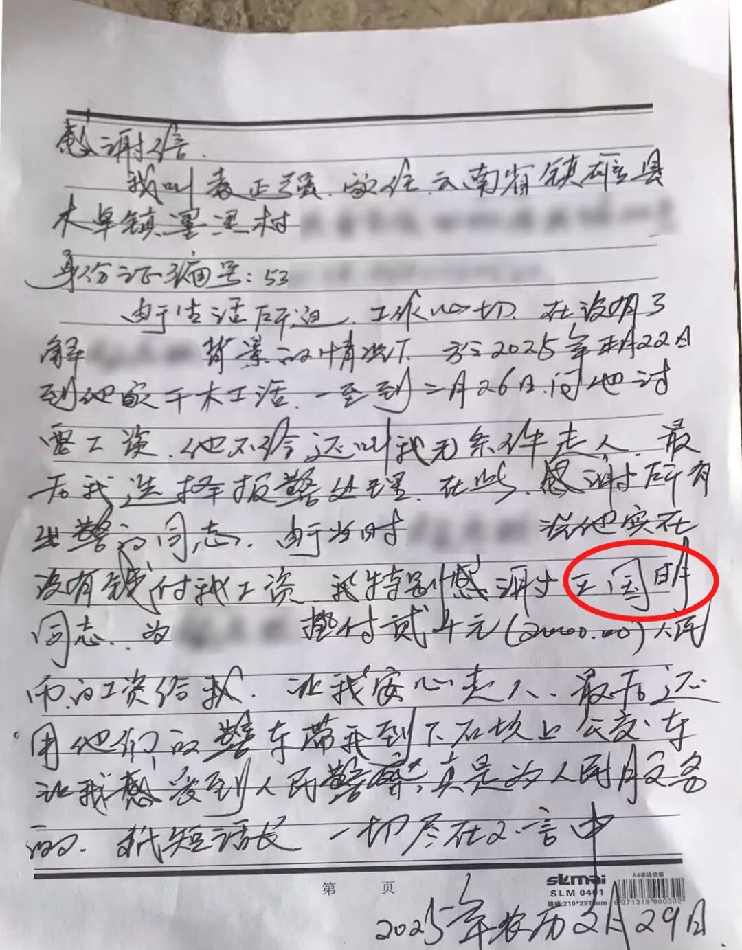 2025年4月22日,一封感谢信辗转送到镇雄县公安局牛场派出所辅警王国民手中,他看着这封信笑得像个小孩,所里战友们纷纷打趣:“王二哥,你又得表扬啦!”