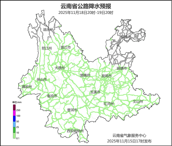 11月18日20时至11月19日20时,各路段无大雨以上量级降水影响。