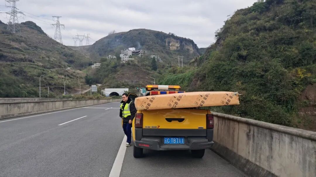 事发当日下午15时,镇雄北隧管站巡查组在开展日常巡逻时,远远发现行车道与超车道交界处横亘着一个大型床垫,蓬松的床垫占据了部分行车空间,过往车辆纷纷紧急避让、减速绕行。“高速上的异物就是流动隐患,必须立即处置!” 巡查组班长陈钊当即下令,巡查人员迅速开启警笛示警,在来车方向设置安全警示区域,引导后方车辆有序通过,随后两人合力将沉重的床垫搬运至巡查车上,仅用5分钟便彻底消除了路面安全隐患。隧管站工作人员对接辖区交管部门后确认失主,通过车辆登记信息,工作人员成功联系上车主鲁先生,此时鲁先生刚抵达目的地,发现货物遗失后焦急万分,接到电话后既惊喜又愧疚。