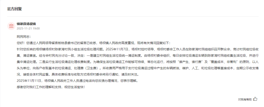 针对您反映的场坝镇场坝村陈家湾村民小组生活垃圾处理问题。2025年11月7日,场坝村挂村领导、场坝村委会工作人员在陈家湾村民组组织召开群众会,商讨村民组垃圾收集、清运事宜。经与会村民充分讨论一致,决定: