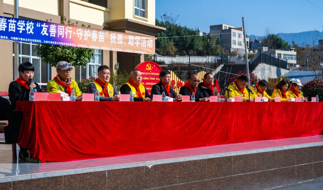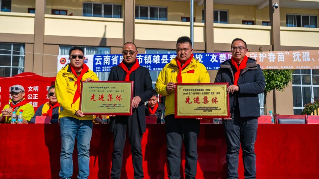 在春苗学校,梁龙勇、罗顺刚代表捐赠方向春苗学校赠予物资支票牌;春苗学校郭祥远校长、旧府街道办事处学区中心校余庭毅校长为镇雄县金悅嘉烘焙食品有限公司、云南舜昌酒店管理服务有限公司等9家爱心企业颁发奖牌,感谢爱心企业的无私奉献;同时为深圳狮子会3个服务队、中国狮子联会北京长安服务队等7个服务队、以及云南代表处青少年服务项目委员会等友队颁发锦旗,以表达对中国狮子会的深切谢意。