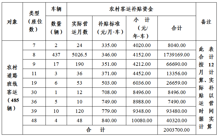 (1)班线客运(200.37万元)。2024年在我县获得农村客运补贴资金的车辆总数为485辆,补贴资金共计200.37万元,按车型标准及实际运行时间区别计算:
