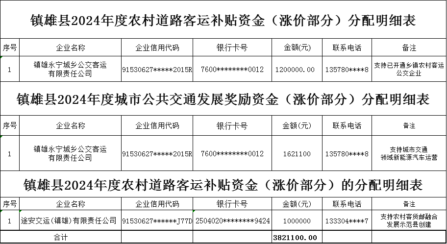 3. 镇雄县2024年度农村客运补贴资金(涨价部分)、城市公共交通发展奖励资金(涨价部分)、农村道路客运补贴资金(涨价部分)分配明细表