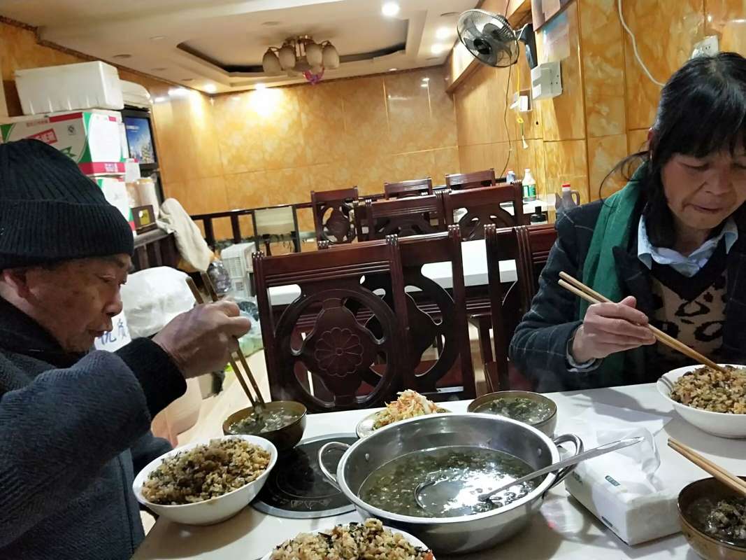 今天中午,我约两个朋友吃米线,但他们说不如吃炒饭,我说可以,我保证让你们吃到全镇雄最好吃的炒饭。于是,我带他俩去街心花园附近的某小吃。用餐的时候,我问二位感觉如何?俩人都说确实好吃。虽说只是个炒饭,但里面酸菜红豆肉末都很多,不但分量超足,而且味道很好,更兼有一碗下菜和一盆正宗的红豆酸汤,那个味道是真的安逸,我们吃得呼尔嘿哟。但由于分量实在是太足了,所以仨人都吃剩了好多!二位说,下次还会去。