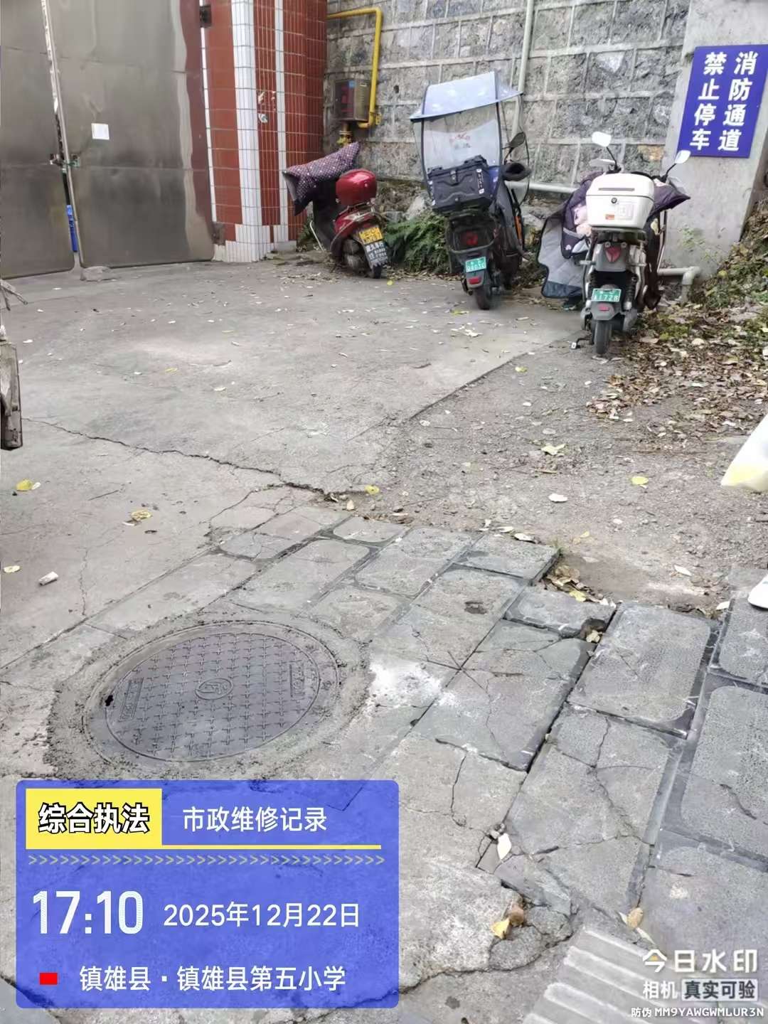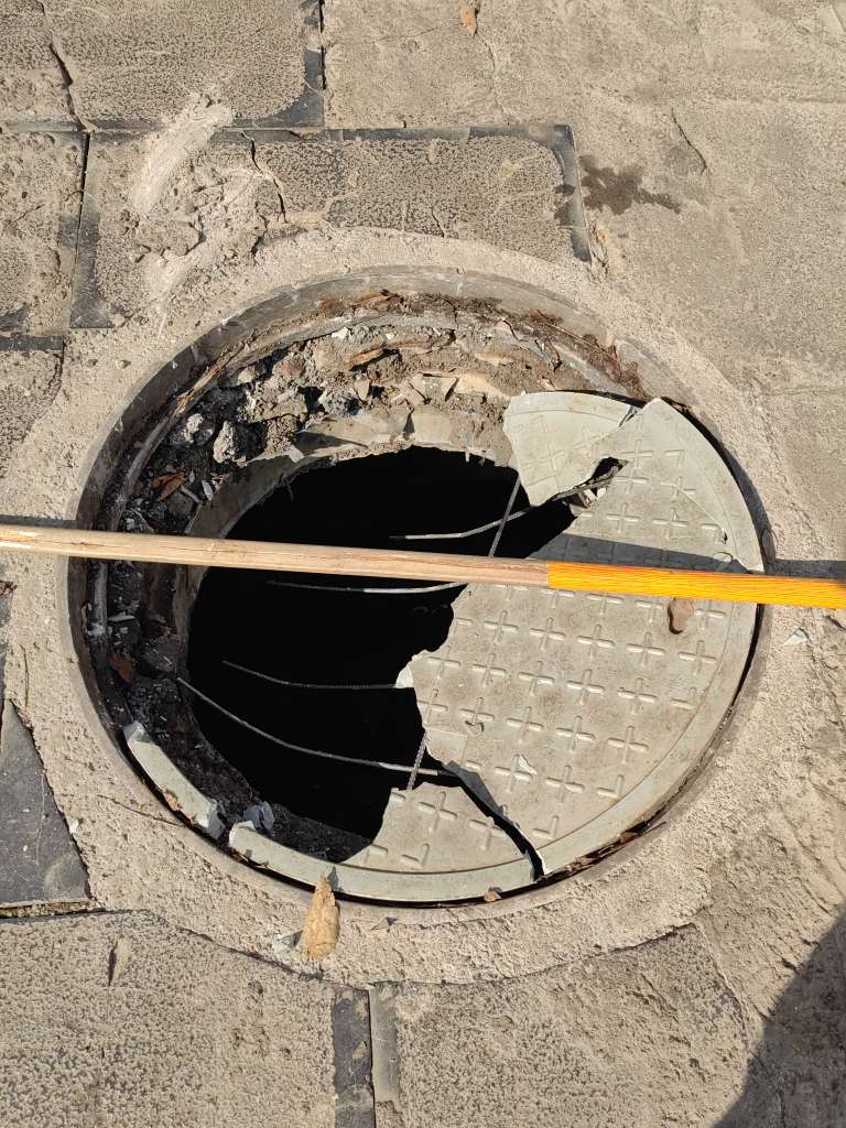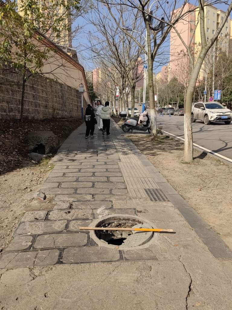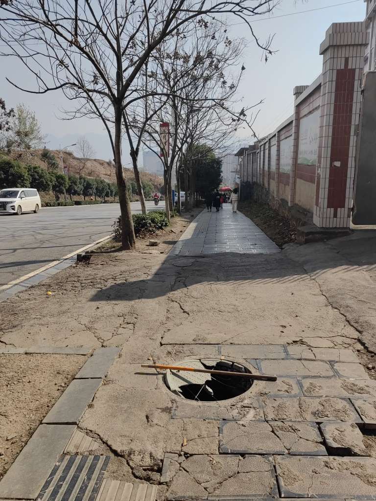 昨天早上(具体时间不详),公租房片区文武三小后门处,一人行道上污水井盖出现险情(如图,疑是被车辆压坏),而此路段是第五小学孩子们上下学的必经通道,往公租房方向的除外)。第五小学沈校长(女)得知(如何得知不详)情况后,立刻安排学校分管安全的副校长对接城管部门相关人员,并通知门卫人员用三个锥筒将破损井盖围起来(如图)以警示过往行人,等待有关人员过来处理。而在此之前,峰哥也已经在微生活发帖,也同时联系了城管部门的相关人员,很快得到回应,到下午五点十分,有关人员已经赶来把破损的井盖处理好(如图)。沈校长得知井盖已经处理好,说:“学生能够平安回家,我也就放心了!”