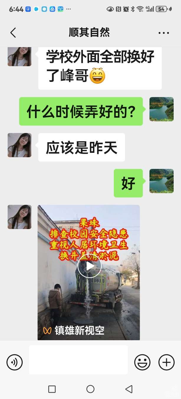 前几天我反映井盖问题的那位雄友发来消息和图片,说井盖问题已经有人正在处理。今天下午,这个网友再次发来照片和视频,说井盖问题已经处理完毕。同时,我还看到《镇雄新视空》的一个视频(本视频峰哥没法保存),说“果珠排查校园安全隐患,重视人居环境卫生,换井盖清淤泥”(见网友聊天记录截图)。网友牵挂的“井盖安全”问题先由峰哥反馈,再由《微生活》转达,最后由果珠乡实施,并因此带动了辖区所有村小隐患井盖的全面修复或换新,无疑,这一举措就像是“及时雨”,迎得了《微生活》全部雄友和大镇雄父老乡亲的点赞!在此,峰哥再次感谢《微生活》,感谢果珠乡政府,感谢那位托我反映问题的网友!