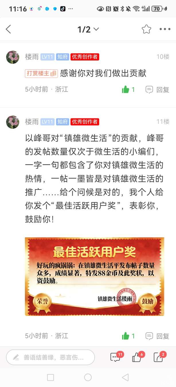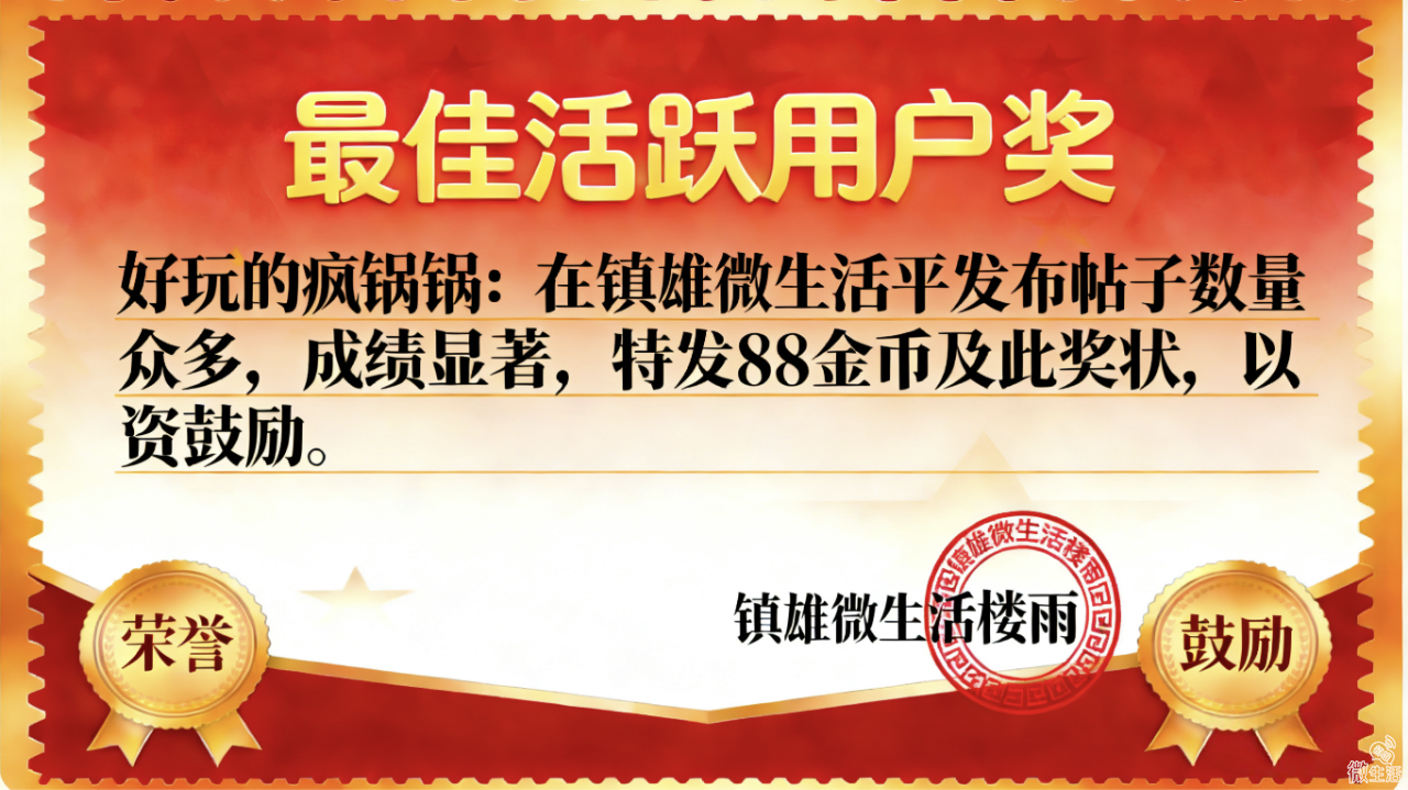 今早,我被雄友“楼雨”兄弟的一段评论逗得笑的不行。评论如下:以峰哥对“镇雄微生活”的贡献,峰哥的发帖数量仅次于微生活的小编们,一字一句都包含了你对镇雄微生活的热情,一帖一墨皆是对镇雄微生活的推广……给个问候是对的,我个人给你发个“最佳活跃用户奖”,表彰你,鼓励你!另外,“楼雨”还代表“微生活”颁给了我一个特殊奖项(如图);同时,“楼雨”又打赏了我88个金币。且不管“楼雨”他能不能代表“微生活”,也不论他打赏的是否真金白银,但至少说明了一条:他“楼雨”对“疯锅锅”是认可的,谢了,兄弟,元旦快乐!