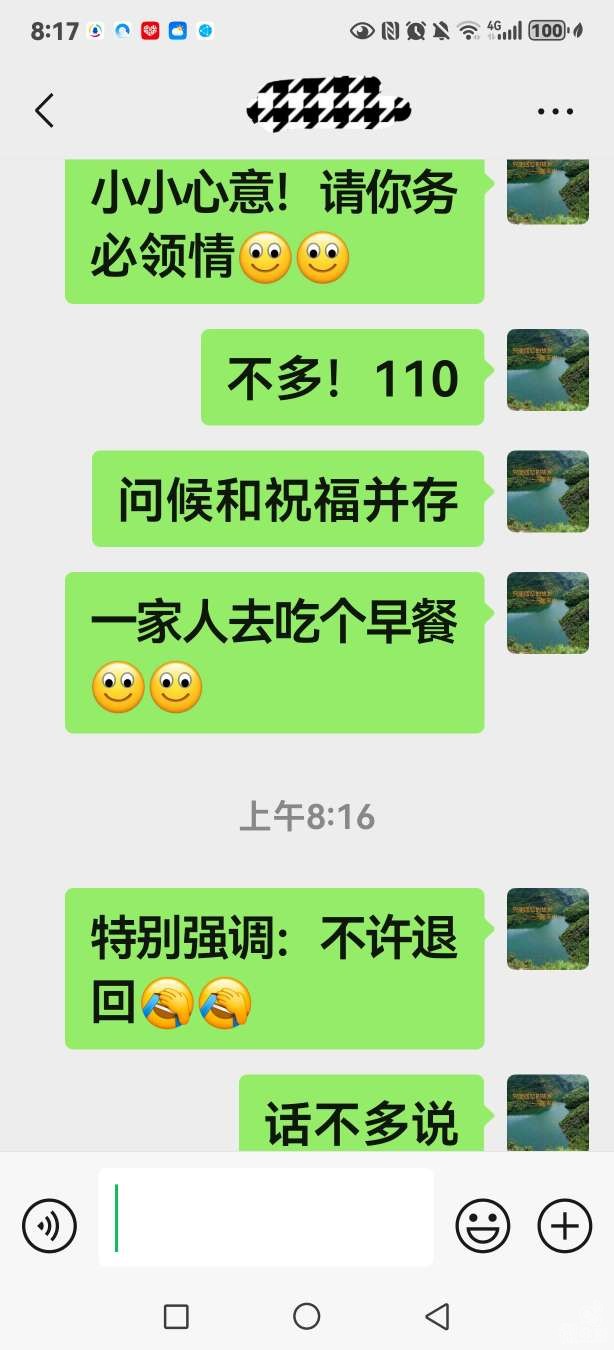 众所周知,昨天是警察节。早上,我醒来的第一件事就是向一警察朋友(也可以说是兄弟)表达节日的问候,并顺便发个“110”表示了哈意思。可是,好说歹说,我这三寸不烂之舌硬是没能感动到他,今早,“意思”给退了回来。按常理,他如此的不服人尊敬,应该是想到我一定非常的生气才对。我确实是有些生气,但也对他的行为表示理解。因为,他平日里根本就不是个不近人情的警察,而且,相反,还是个挺有人情味的家伙!好吧,警察同志,保重身体!