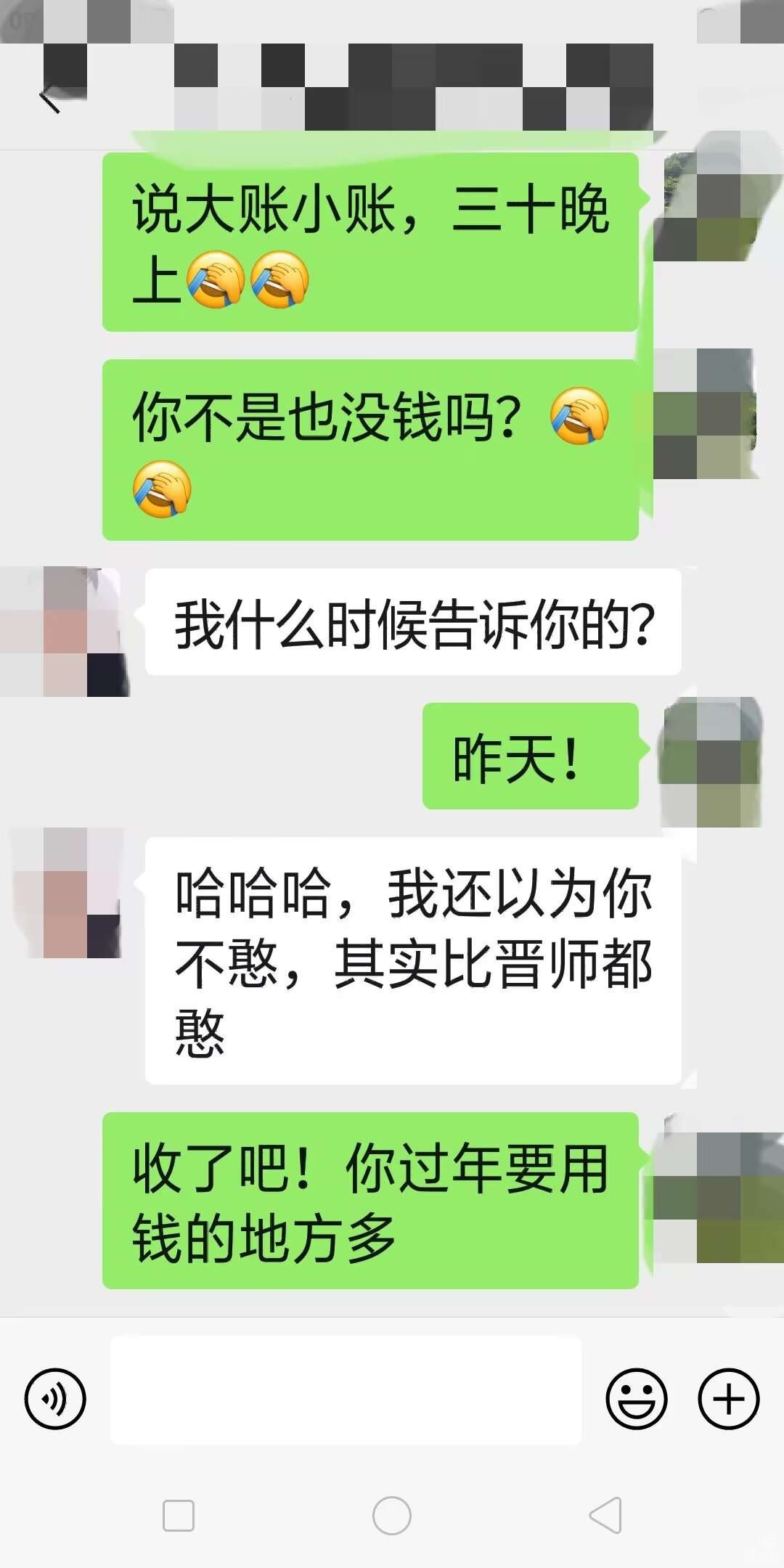 俗话说的好:大账小账,三十晚上。这不,前久因为财政赤字,万般无奈之下,跟朋友借了点钱救急,想到马上过年了,就跟他把钱转过去。未曾想,这家伙竟然不收,说叫我先用倒,等手头宽裕了再还。等宽裕了再还?那我恐怕是永远都没有这一天。好说歹说,终于劝服他把转账领了!都说还掉的是账,拜掉的是年,既然当初人家都信得过我,那我又怎能让人家失望?谢谢你,朋友!