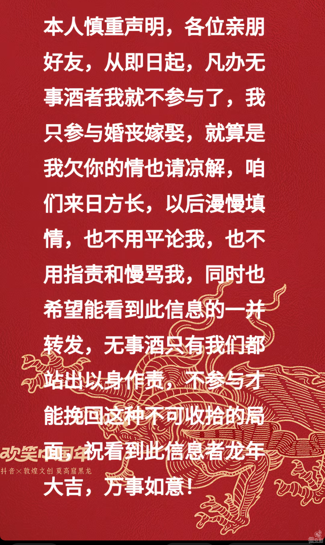 最近被各种新房搬迁的无事酒轮番轰炸,短短几天随礼就花出去好几千,实在让人身心俱疲。本是红白喜事才有的人情往来,如今却被各类非必要的宴席占满,不去吧,人家亲自请到门上,驳了面子伤了人情;去吧,又并非传统该贺的场合,纯纯是花钱凑数,徒增经济负担。 身边的乔迁酒一波接一波,仿佛成了新的人情攀比,让简单的礼尚往来变了味,也让普通人家被这份莫名的规矩裹挟。真心希望相关部门能重视起来,好好整治下无事酒的不良风气,守住红白喜事的传统底线,让人情往来回归纯粹,不再被过度的宴席和礼金压得喘不过气。