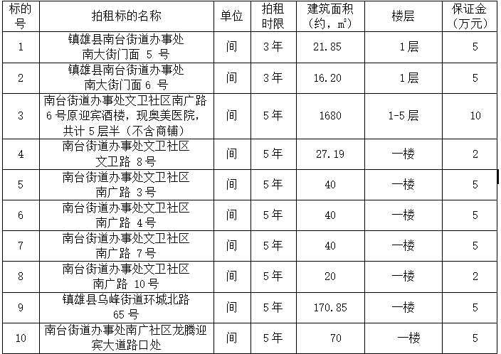 受镇雄县南台街道办事处相关居民委员会委托,我公司将对以下标的进行公开拍租。相关事项如下: