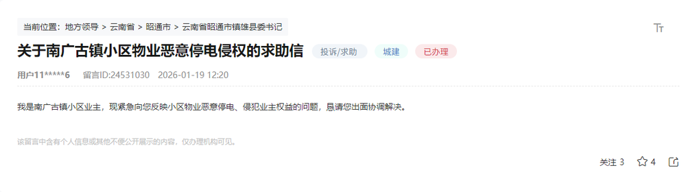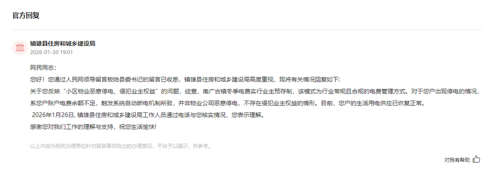 镇雄一网友留言:小区物业恶意停电!官方回复→