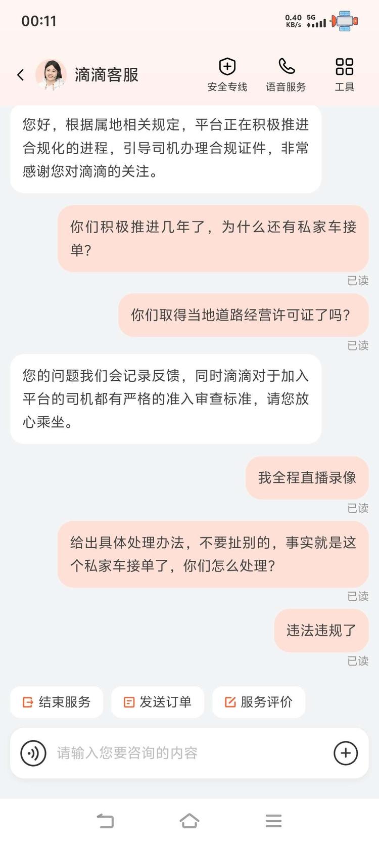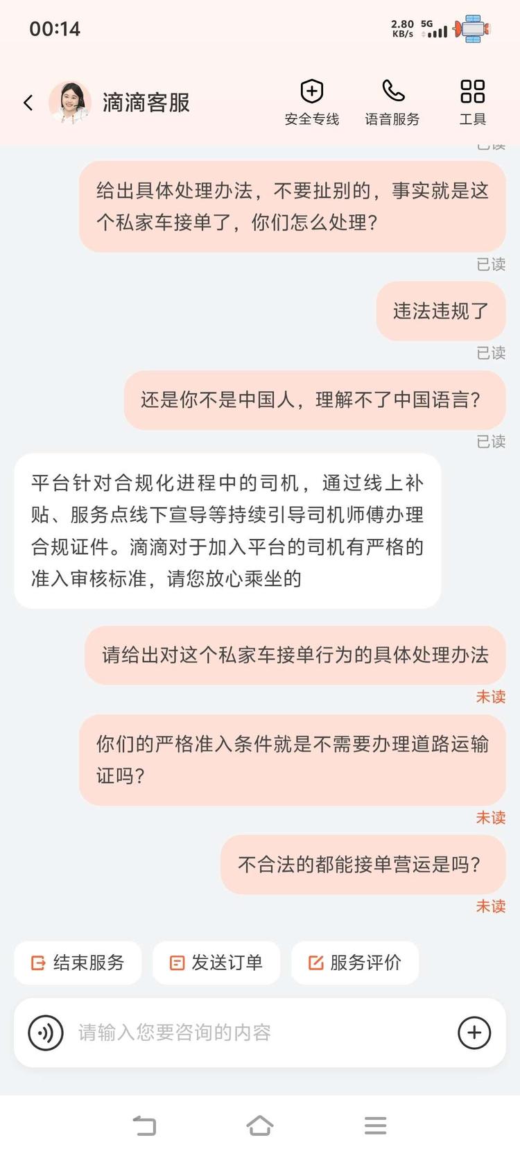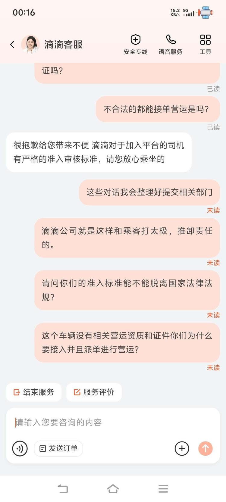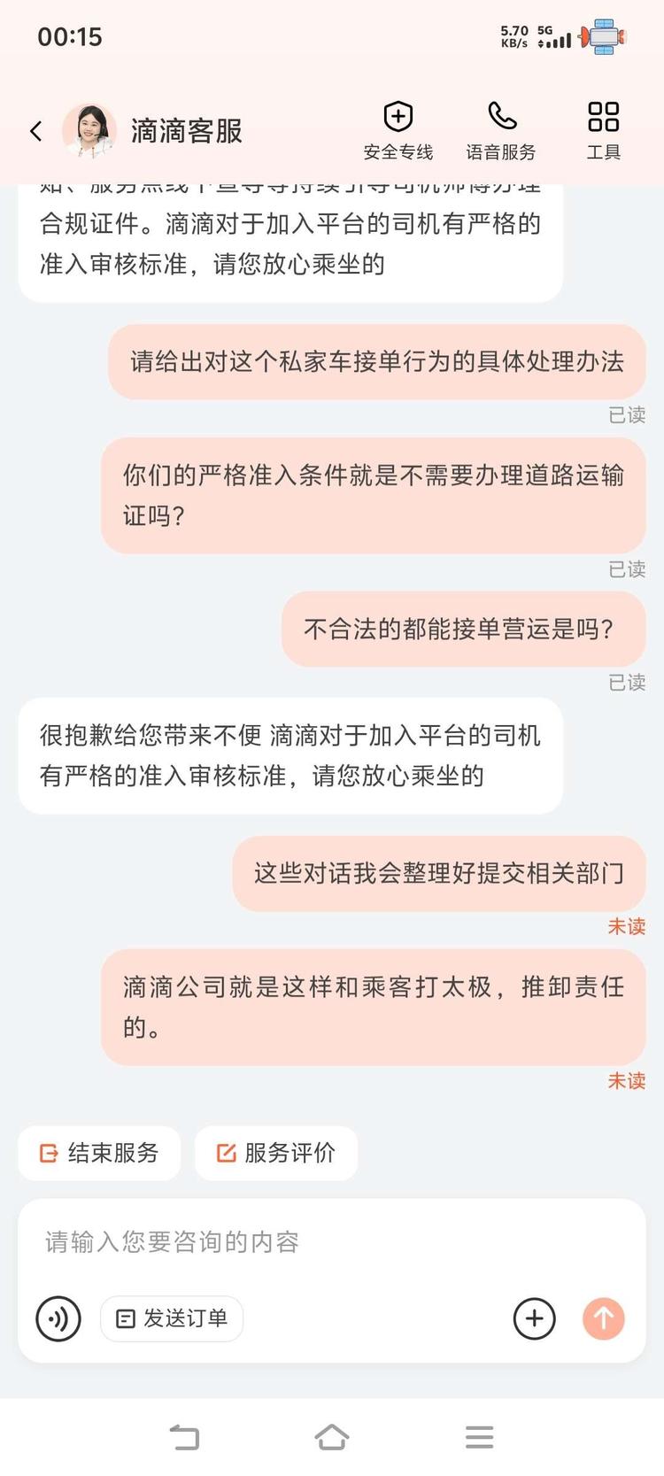滴滴公司口口声声为了乘客安全着想,多年来一直未取得道路经营许可证的情况下组织大量私家车非法营运,就这还口口声声为了乘客安全负责?!你拿什么来负责。以下是我和滴滴客服对话,还有滴滴公司给我来电我也录音了,录音传不上来。
