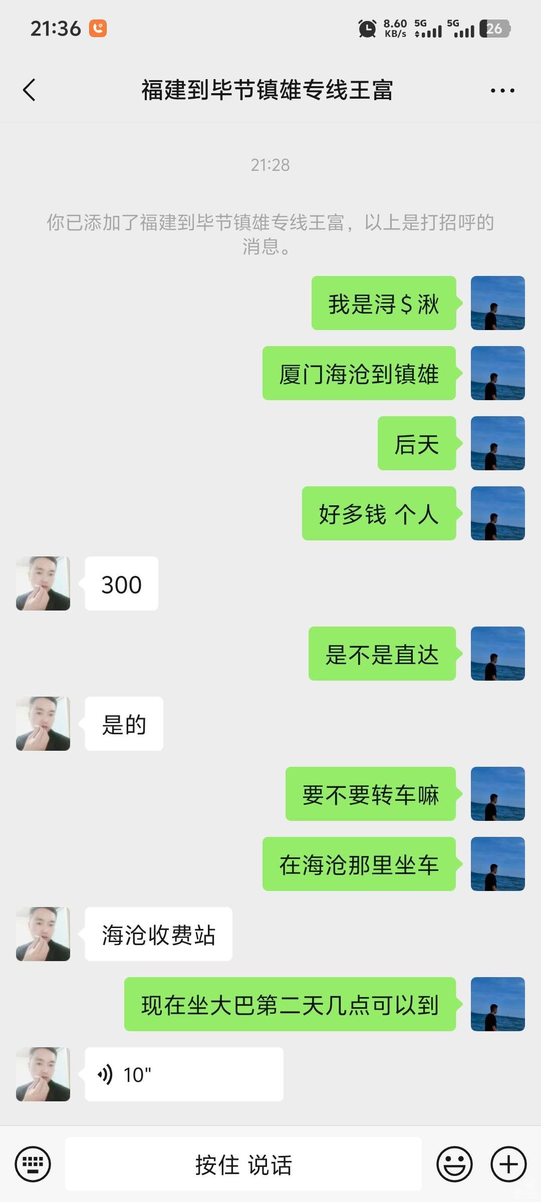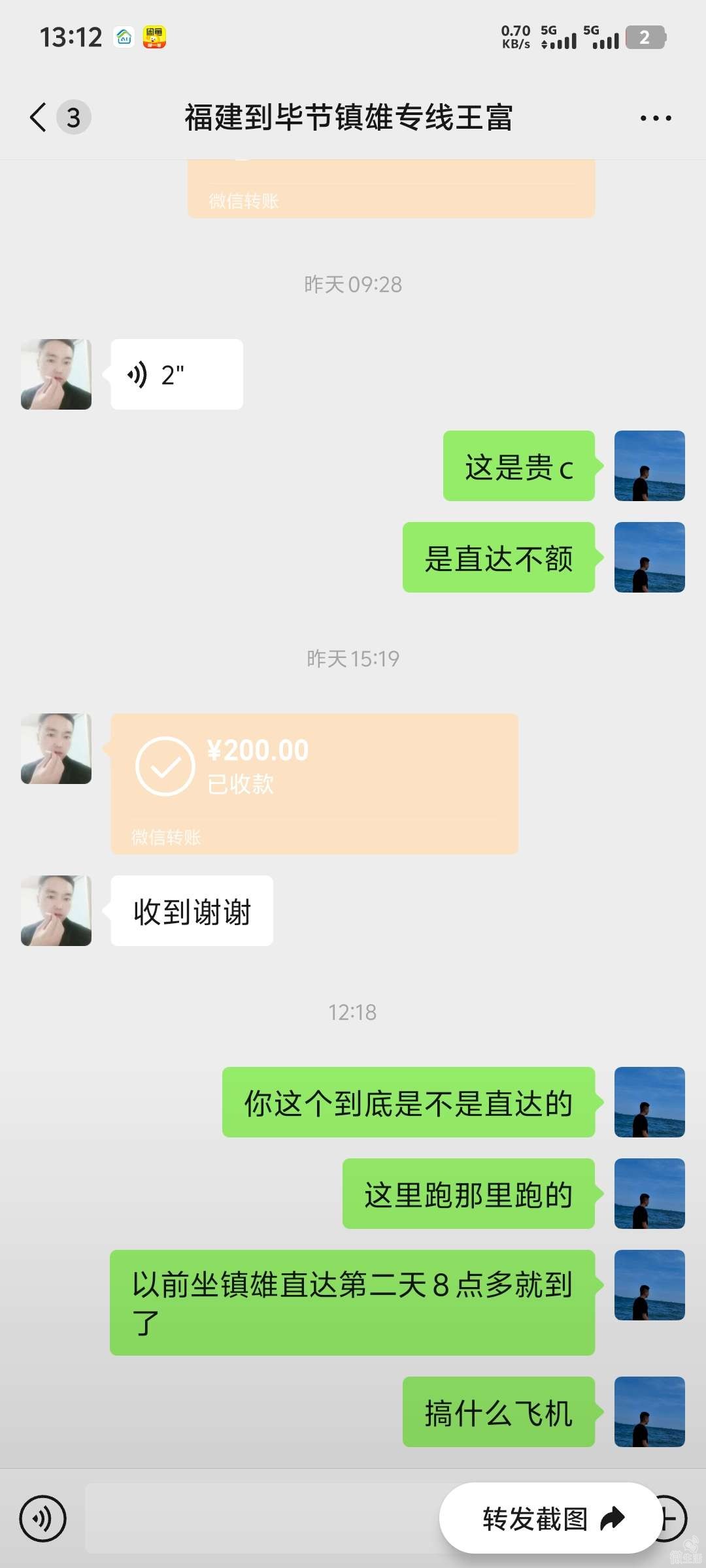 我在厦门通过微信群里一个王富的名称购买厦门到镇雄直达车,结果从海沧上车后到处接人,半路堵车司机停车熄火窗户不开门不开,到达毕节后大巴车司机叫我们镇雄的9人下车用面包车拉我们到镇雄,我们9人上了面包坐几十分钟我们说要投诉,后面把我们两个放下车坐毕节到镇雄的大巴车,买票之前明确问了是不是直达买票人说是,结果毕节转车