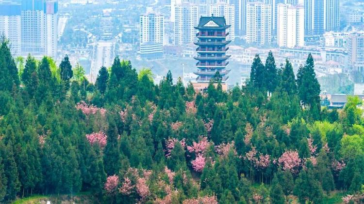 粉白的花树错落生长在浓绿的松柏之间