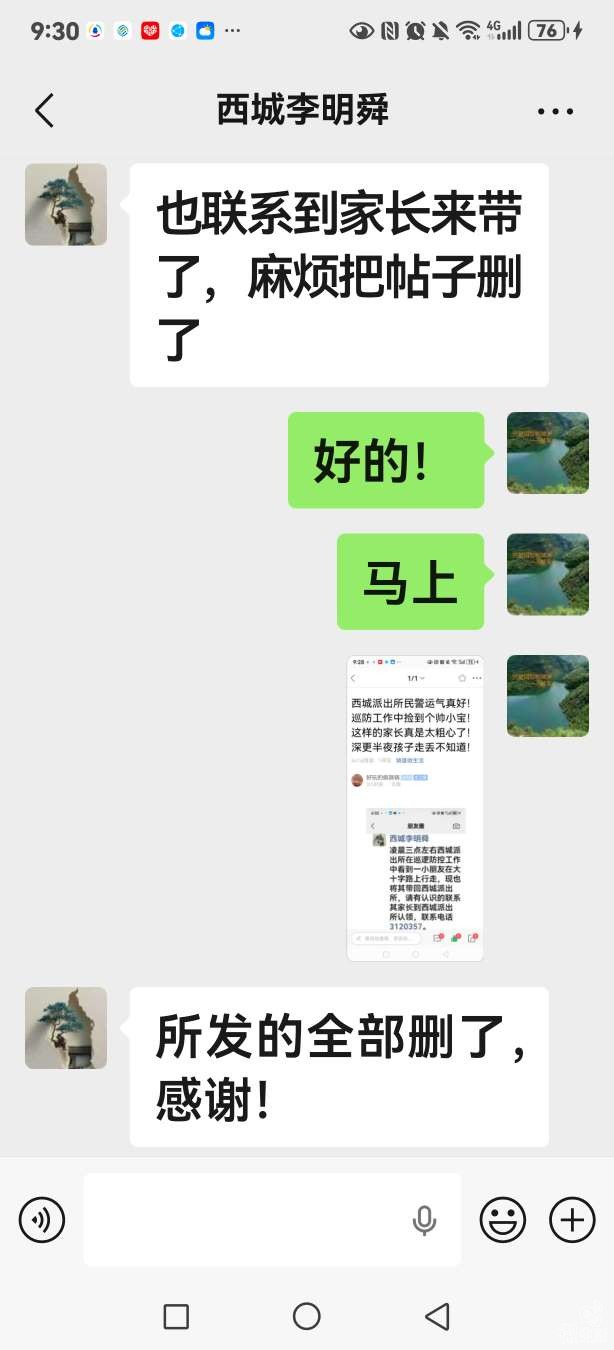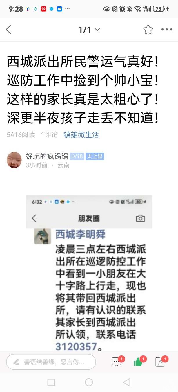 今早,峰哥在社区发布了一个“西城派出所民警在巡防工作中捡到一个孩子”的帖子,引起了雄友们的关注,短时间内点击便达到五六千。就在刚才,西城所的兄弟发来消息,说孩子已经被家长前来领走,让我删了帖子。在此,谢谢大家关注,同时祝西城所的民警们身体健康心情舒畅一切安好!