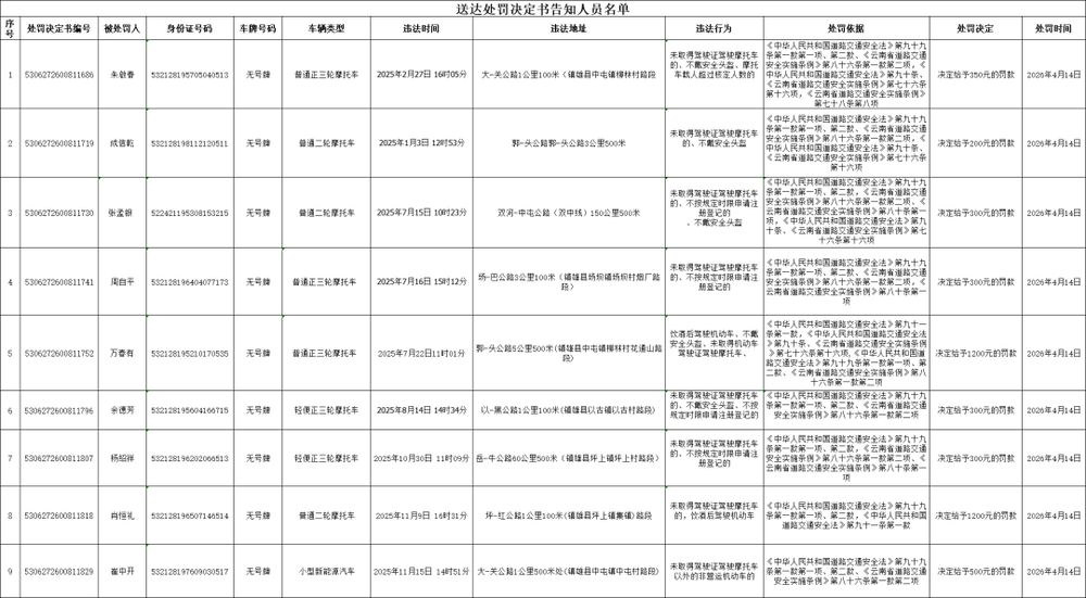 镇雄县公安局关于送达公安交通管理行政处罚决定书的公告(第二期)